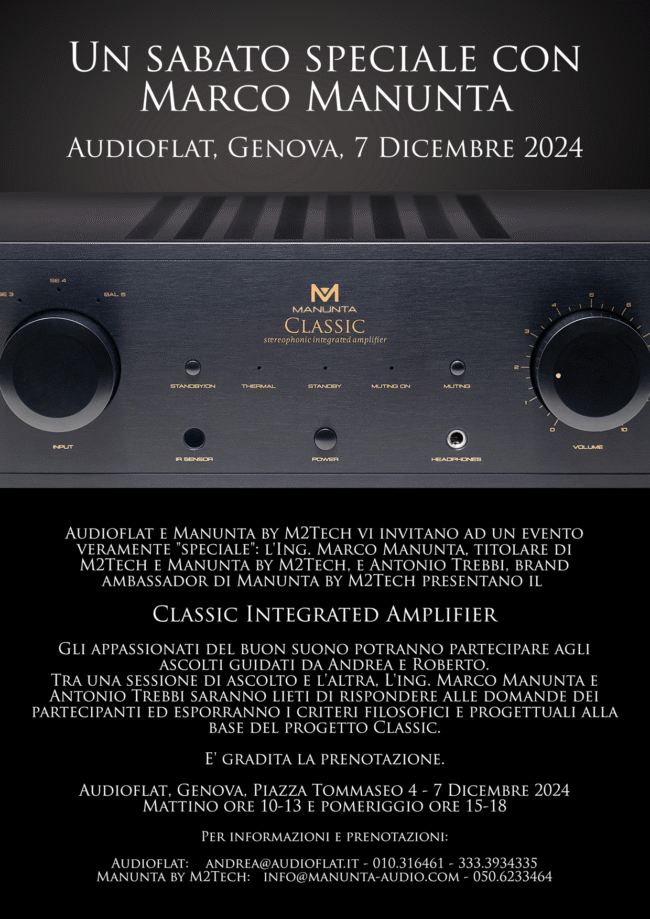 Manunta by M2Tech and Audioflat invite audiophile friends on Saturday, December 7 at the Audioflat store in Genoa for a colloquial meeting during which the Classic Integrated Amplifier will be presented in a series of listening sessions run by Andrea and Roberto. We look forward to seeing you at Audioflat, Tommaseo Square, 4 in Genoa.