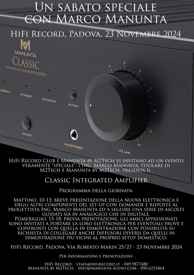 Manunta by M2Tech and HiFi Record Club invite audiophile friends on Saturday, November 23, at the HiFi Record store in Padua for a colloquial meeting during which the Classic Integrated Amplifier will be presented in a system of Italian excellence. We look forward to seeing you at HiFi Recordi, 25/27 Roberto Marin Street in Padua,…