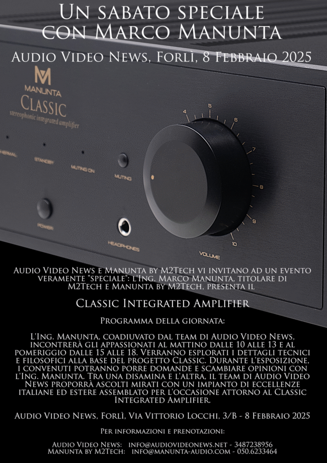 Manunta by M2Tech and Audio Video News invite audiophile friends on Saturday, Feb. 8, at the Audio Video News store in Forli for a colloquial meeting during which the Classic Integrated Amplifier will be presented in a series of listening sessions run by Emanuele Bonfante. We look forward to seeing you at Audio Video News,…