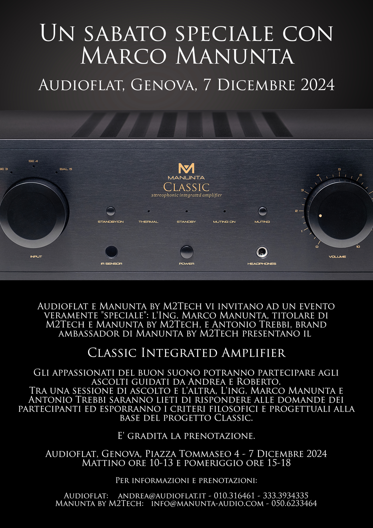 DetailsManunta by M2Tech and Audioflat invite audiophile friends on Saturday, December 7 at the Audioflat store in Genoa for a colloquial meeting during which the Classic Integrated Amplifier will be presented in a series of listening sessions run by Andrea and Roberto. We look forward to seeing you at Audioflat, Tommaseo Square, 4 in Genoa.