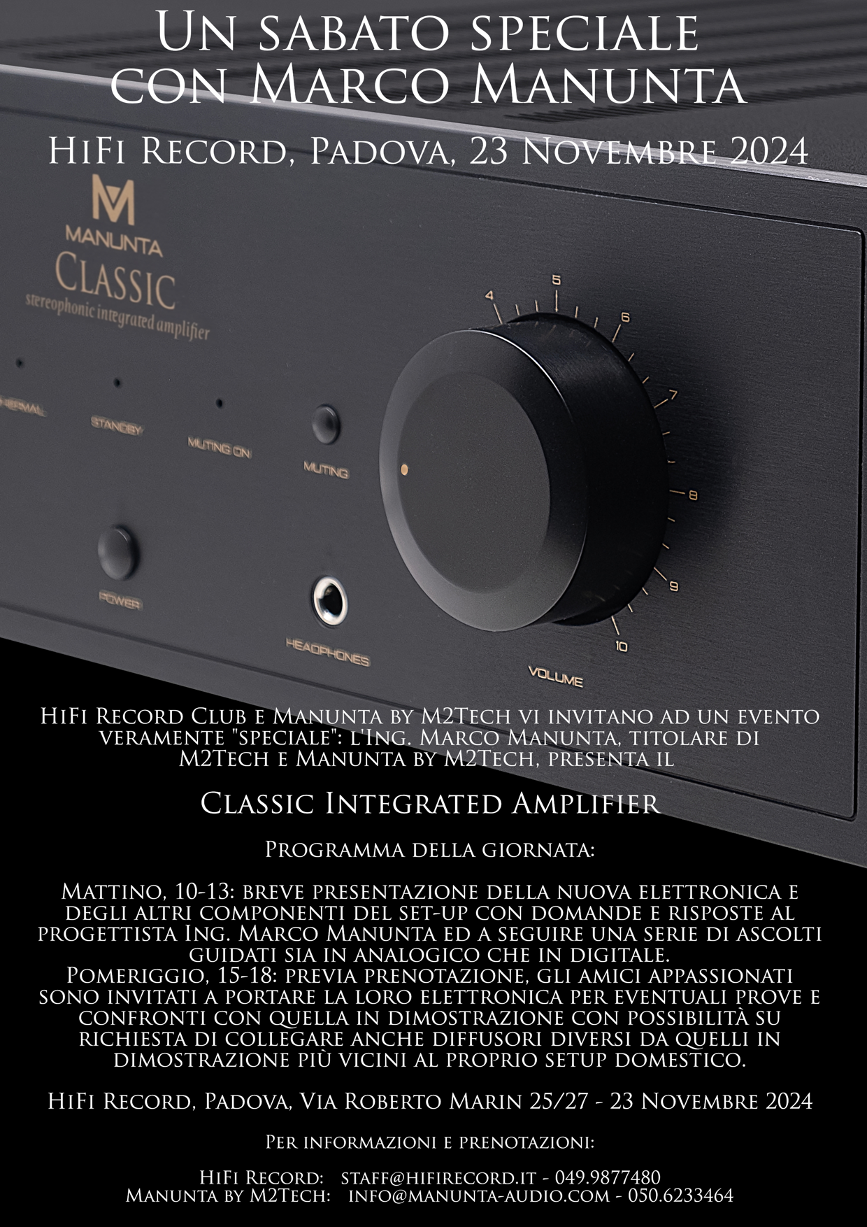 DetailsManunta by M2Tech and HiFi Record Club invite audiophile friends on Saturday, November 23, at the HiFi Record store in Padua for a colloquial meeting during which the Classic Integrated Amplifier will be presented in a system of Italian excellence. We look forward to seeing you at HiFi Recordi, 25/27 Roberto Marin Street in Padua,…