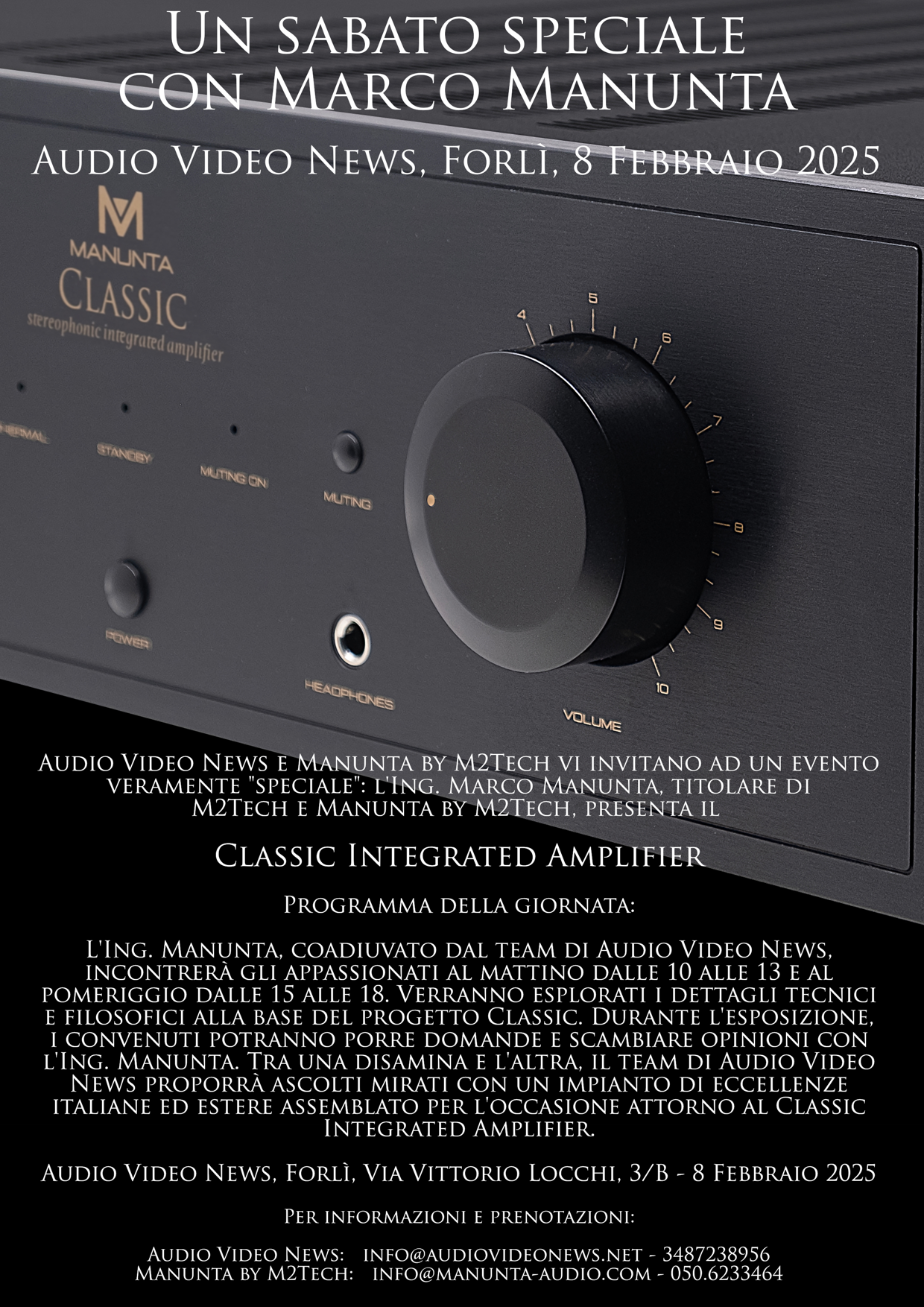 DetailsManunta by M2Tech and Audio Video News invite audiophile friends on Saturday, Feb. 8, at the Audio Video News store in Forli for a colloquial meeting during which the Classic Integrated Amplifier will be presented in a series of listening sessions run by Emanuele Bonfante. We look forward to seeing you at Audio Video News,…