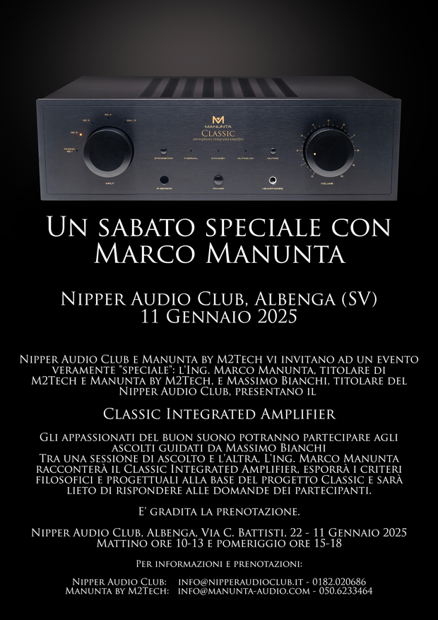 DetailsManunta by M2Tech and Nipper Audio Club invite audiophile friends on Saturday, January 11, at the Nipper Audio Club store in Albenga (SV) for a colloquial meeting during which the Classic Integrated Amplifier will be presented in a series of listening sessions run by Massimo Bianchi. We look forward to seeing you at Nipper Audio…